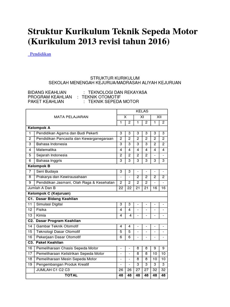 Struktur Kurikulum Teknik Sepeda Motor K13 Revisi 2016