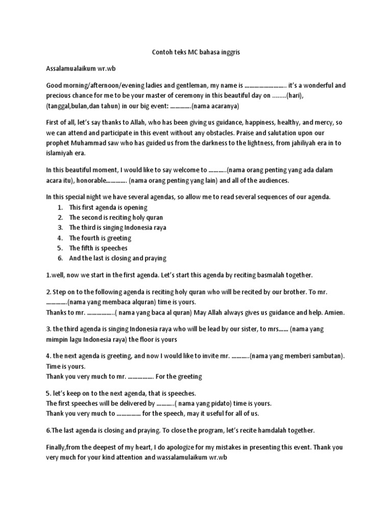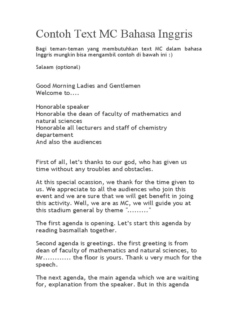 Contoh Teks Mc Dalam Bahasa Inggris Leng