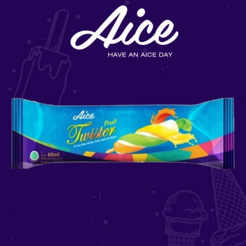 Aice fruit twister. Kombinasi nikmatnya es krim cokelat dan saus. Perusahaan tersebut mendirikan pabrik di Kawasan Industri MM2100 Cikarang dan telah membuat banyak produk es krim diantaranya Aice Mango Slush Chocolate Sundae dan Fruit Twister. Lihat Produk Es KrimAice.